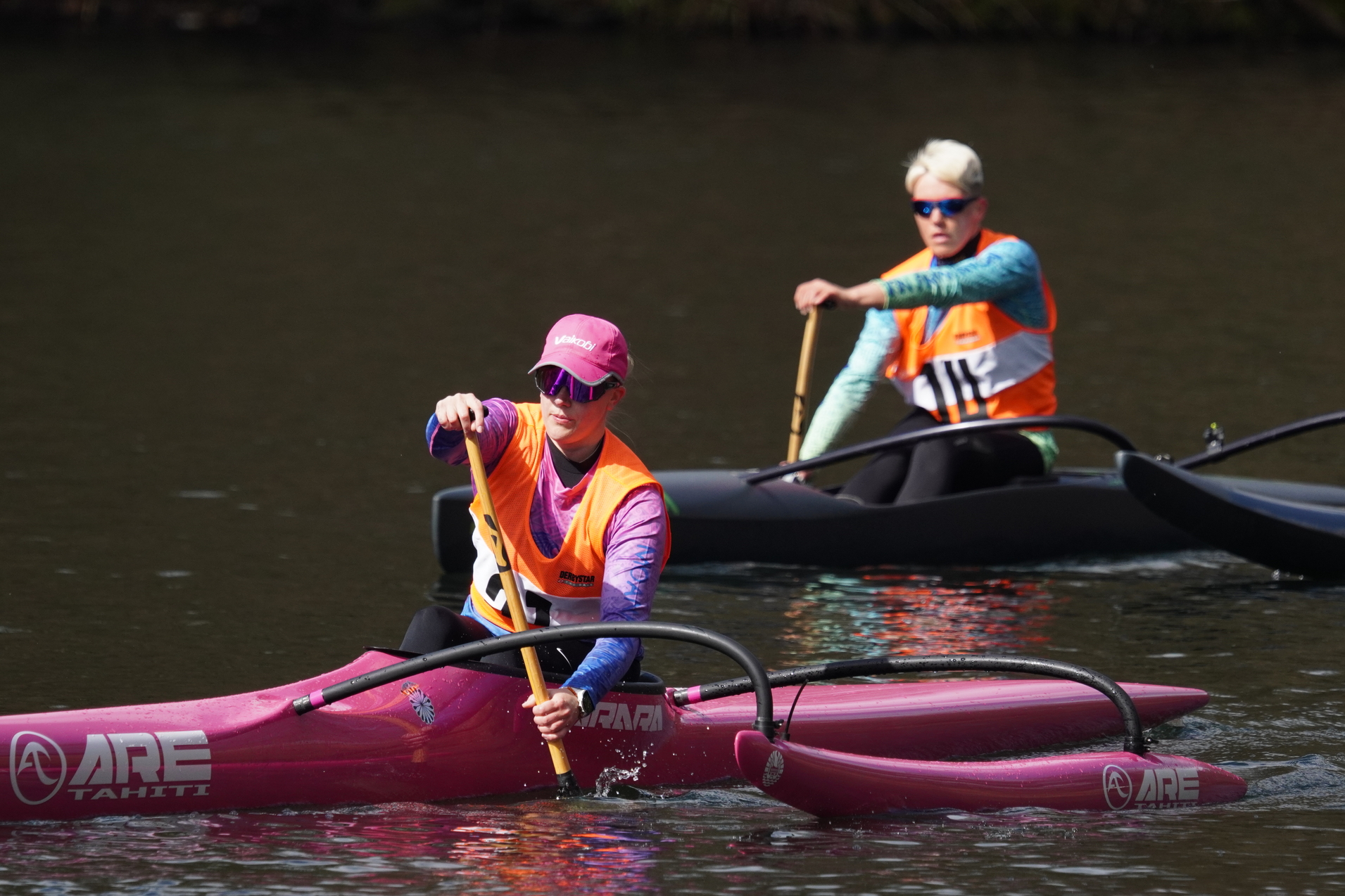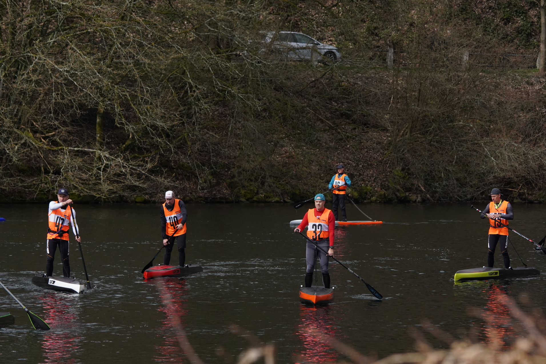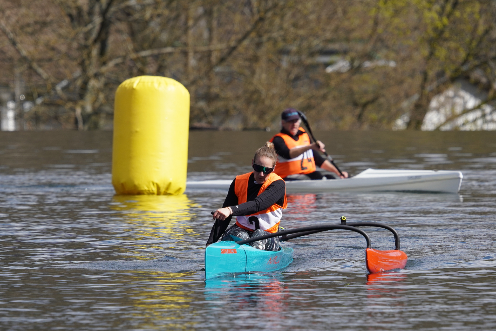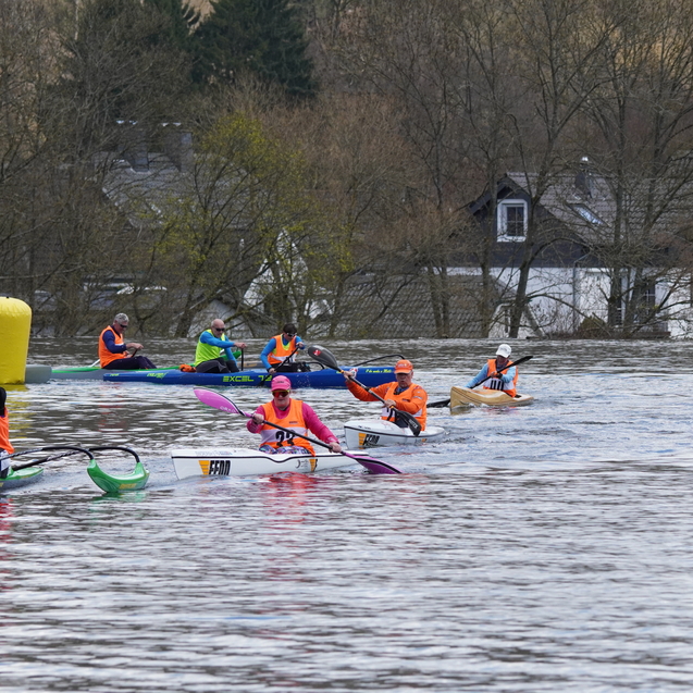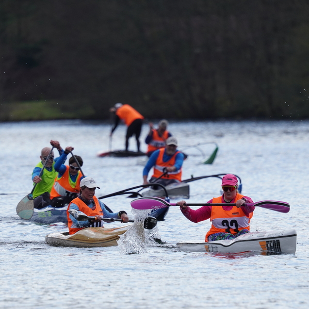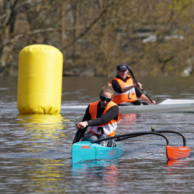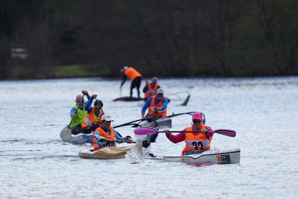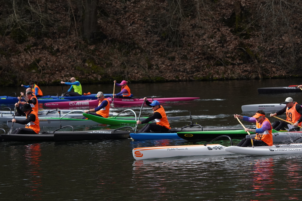 Vorweg starteten die Surfski auf die erste lange Gerade, mit einer Minute Zeitverzögerung wurden dann die restlichen Paddler*innen auf den Weg geschickt. Sofort bildeten sich kleine Grüppchen gleichstarker Paddler*innen, die um die beste Mitfahrgelegenheit auf einer schnellen Welle kämpften. Bis zur ersten, engen Wende hatte das Teilnehmendenfeld sich jedoch so weit entzerrt, dass keine Karambolage zu befürchten war. Spätestens in der zweiten Wende – die weitläufig rechtsherum durch das Staubecken vor dem Beyenburger Dorf-Panorama gefahren wurde – hatte Surfskifahrer Torben Fröse sich sichtbar von den anderen Booten abgesetzt. Fröse blieb der einzige, der die etwa zwölf Kilometer lange Strecke mit neun Wenden in knapp unter einer Stunde absolvieren würde, sodass der Gesamtsieg in Wuppertal blieb. Auf der Strecke waren zahlreiche Zweikämpfe zu beobachten, die häufig durch den berühmten langen Atem und teilweise durch geschicktes Taktieren in den Wenden entschieden wurden. Im Vorteil war hier, wer über ausreichend Rennerfahrung verfügte, um auch in stressigen Situationen einen kühlen Kopf zu bewahren.