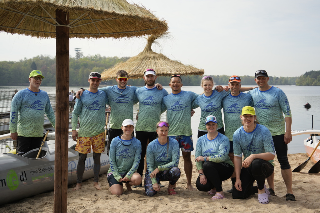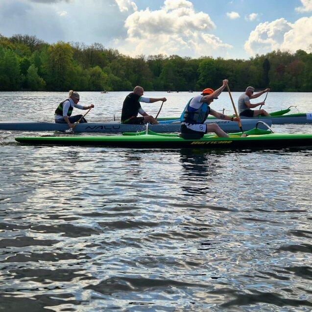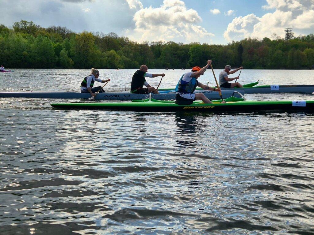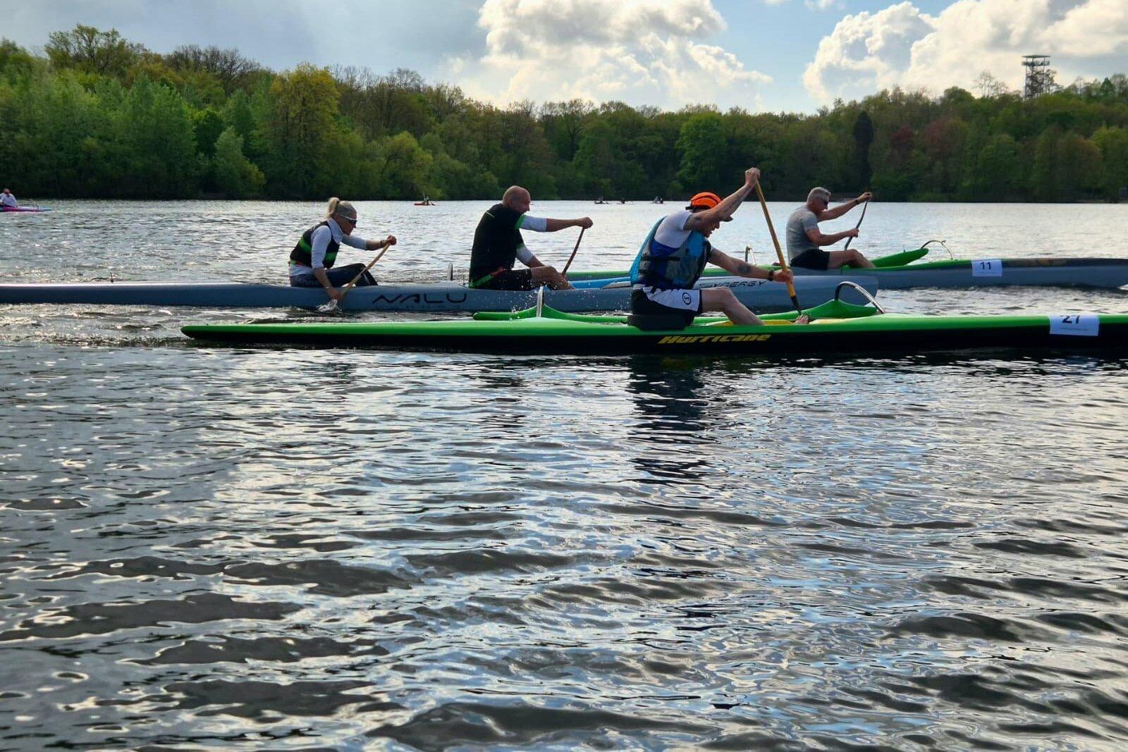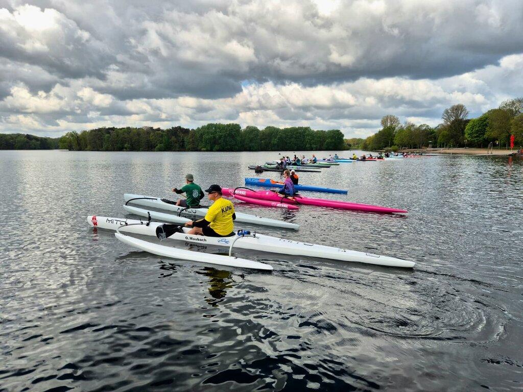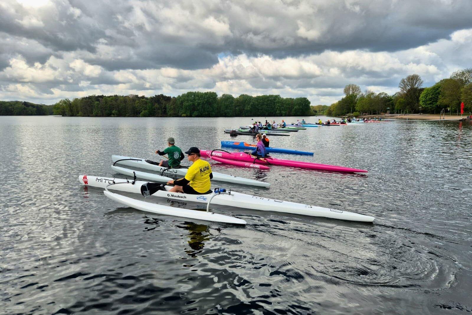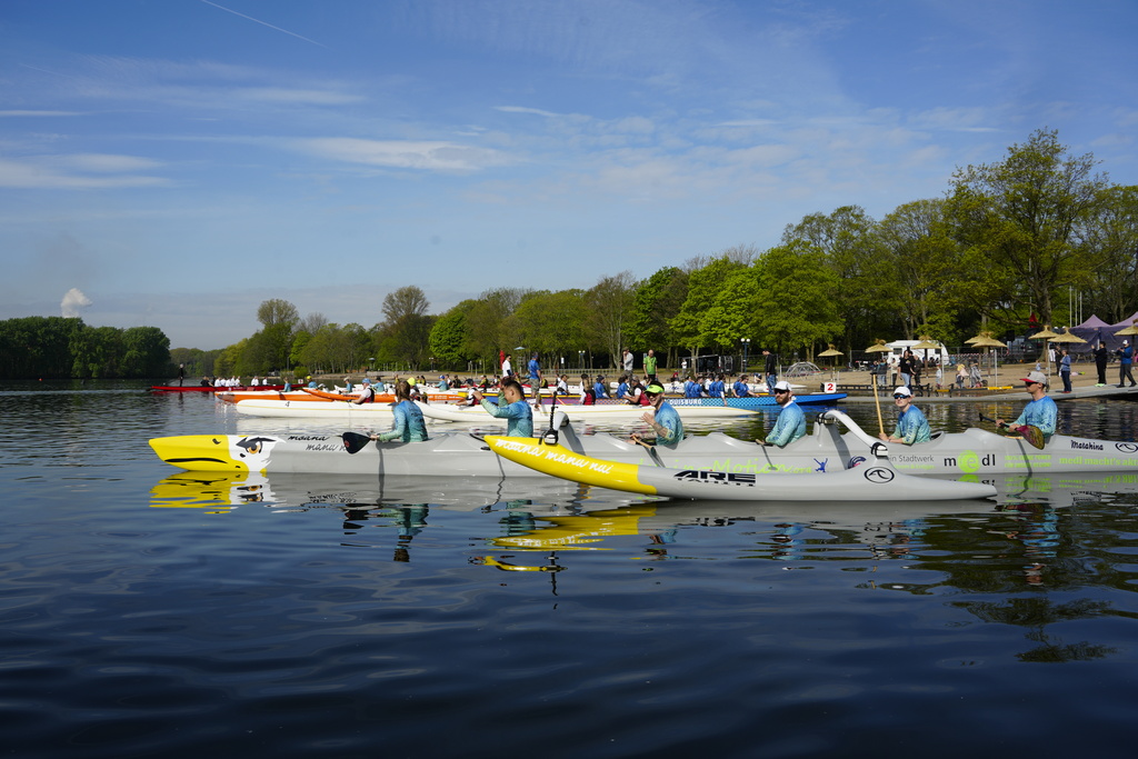 Wenn man bei der Wanheimer Kanu-Gilde (WKG) in Duisburg zum Paddeln zu Gast ist, kommen schnell Ozean-Gefühle auf: Auf dem Sandstrand des angrenzenden Seebads lagen am Wochenende vom 18. und 19 April die bunten Outrigger, Va‘a und Surfski bereit, unter den Sonnenschirmen warteten die Paddler*innen darauf, dass der Rennbeginn näher rückte. Zum Glück ist bei der WKG ausreichend Platz vorhanden, denn das Starterfeld konnte sich sehen lassen. Insgesamt 36 Einer- und Zweierboote waren bei der fünften Auflage des IslandRace an den Start gegangen. Dementsprechend eindrucksvoll fiel der Massenstart aus, bei dem der – ansonsten ungewöhnlich ruhige – See ganz schön in Bewegung kam. Für die Paddler*innen standen knapp 10,5 Kilometer auf dem Programm, die im Rundkurs um die namensgebende Insel auf dem Wolfssee gefahren wurden.