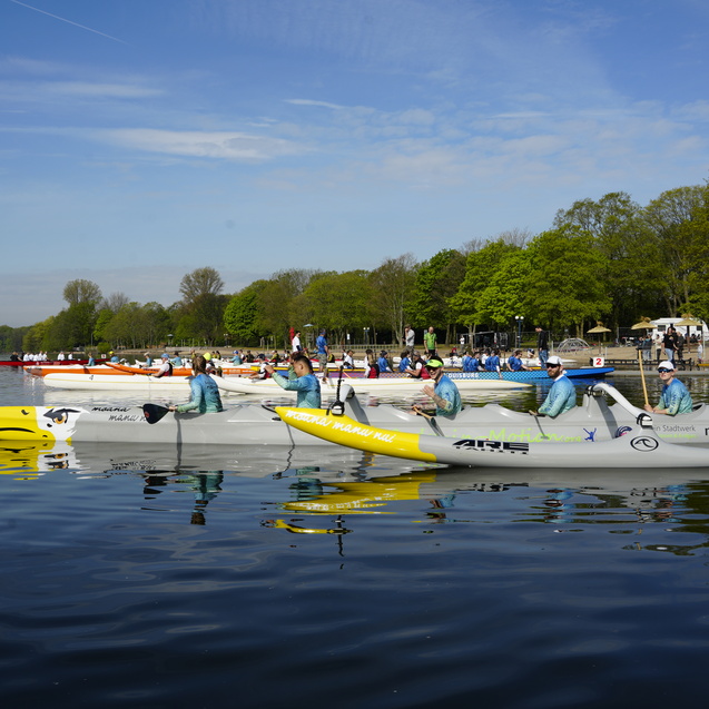 Doch nicht nur die zweite Veranstaltung der Rennserie war ein Highlight für den Ocean Sport in Nordrhein-Westfalen, denn bereits am Samstag starteten Va‘a-Sechser zwischen Drachenbooten. Im letzten Jahr waren dies zwei Sechser des Duisburger Wassersport-Vereins Niederrhein. Pünktlich zur diesjährigen Auflage hatte sich wohl herumgesprochen, dass auch eine weitere Anreise lohnenswert ist: Ganze sieben Va‘a-Sechser gingen an den Start. Den Sieg holte sich das Team „Moana Manu Nui“ vom WSV Niederrhein, dicht gefolgt von einem Boot der Neckardrachen. Die zweite Duisburger Mannschaft „Maui“ verfehlte knapp das Treppchen und machte den vierten Platz.