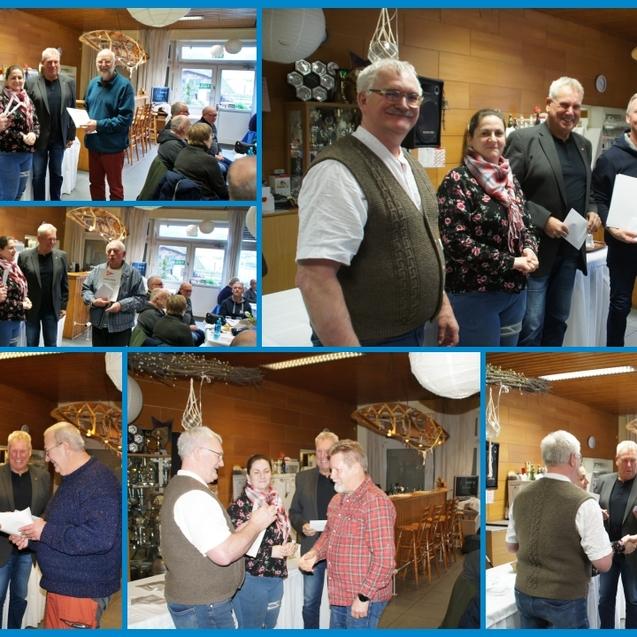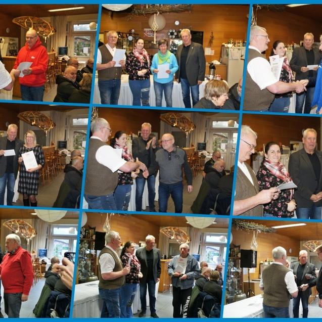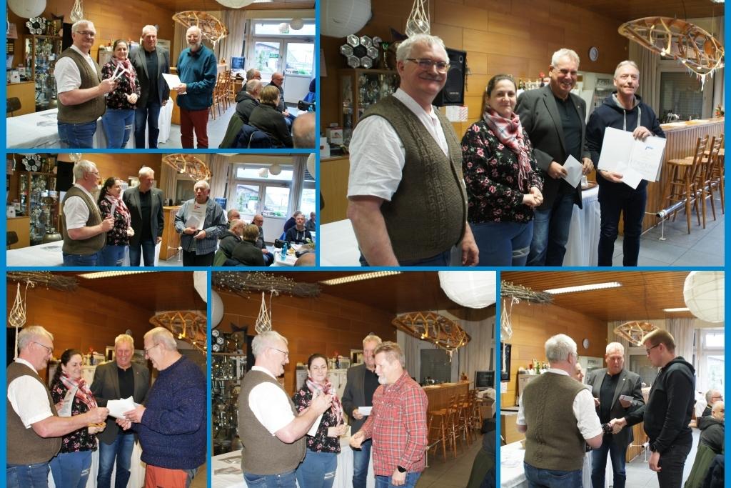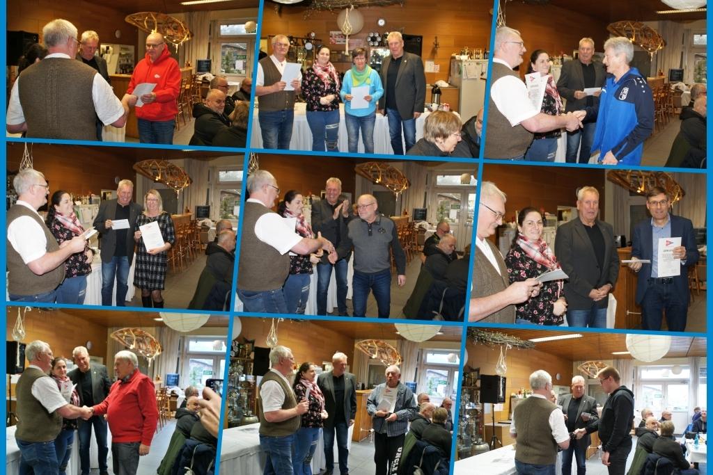 Nachdem sich die Teilnehmer zur Ehren der Verstorbenen zu einer Schweigeminute erhoben haben, nehmen Erhard Krumnack, Stefanie Gillmann-Schniedenharn und Frank Schniedenharn Sportlerehrungen für die Erlangung von Wandersportabzeichen vor.